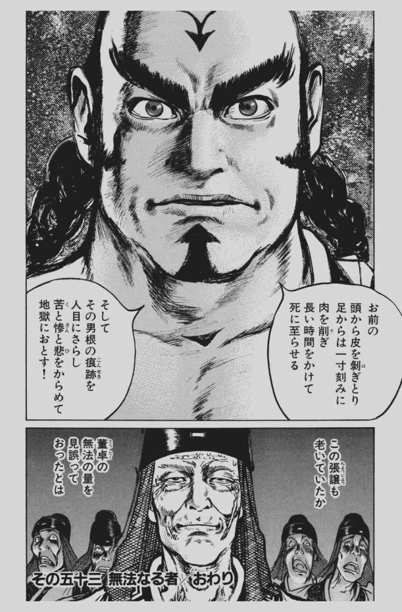 もうこの1コマで掴みはバッチリ。曹操があれほど辛酸を舐めさせられた張譲をゴミのように片付けて董卓が新たなボスの座に着くという、あまりにも完璧すぎるエピソードでした。